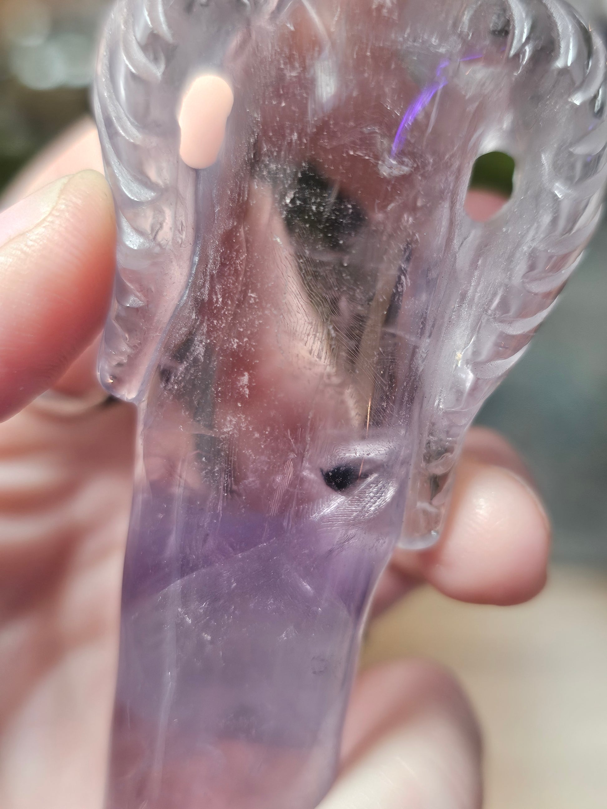 Crystal quality Amethyst Rose carving with hollandite inclusions.
