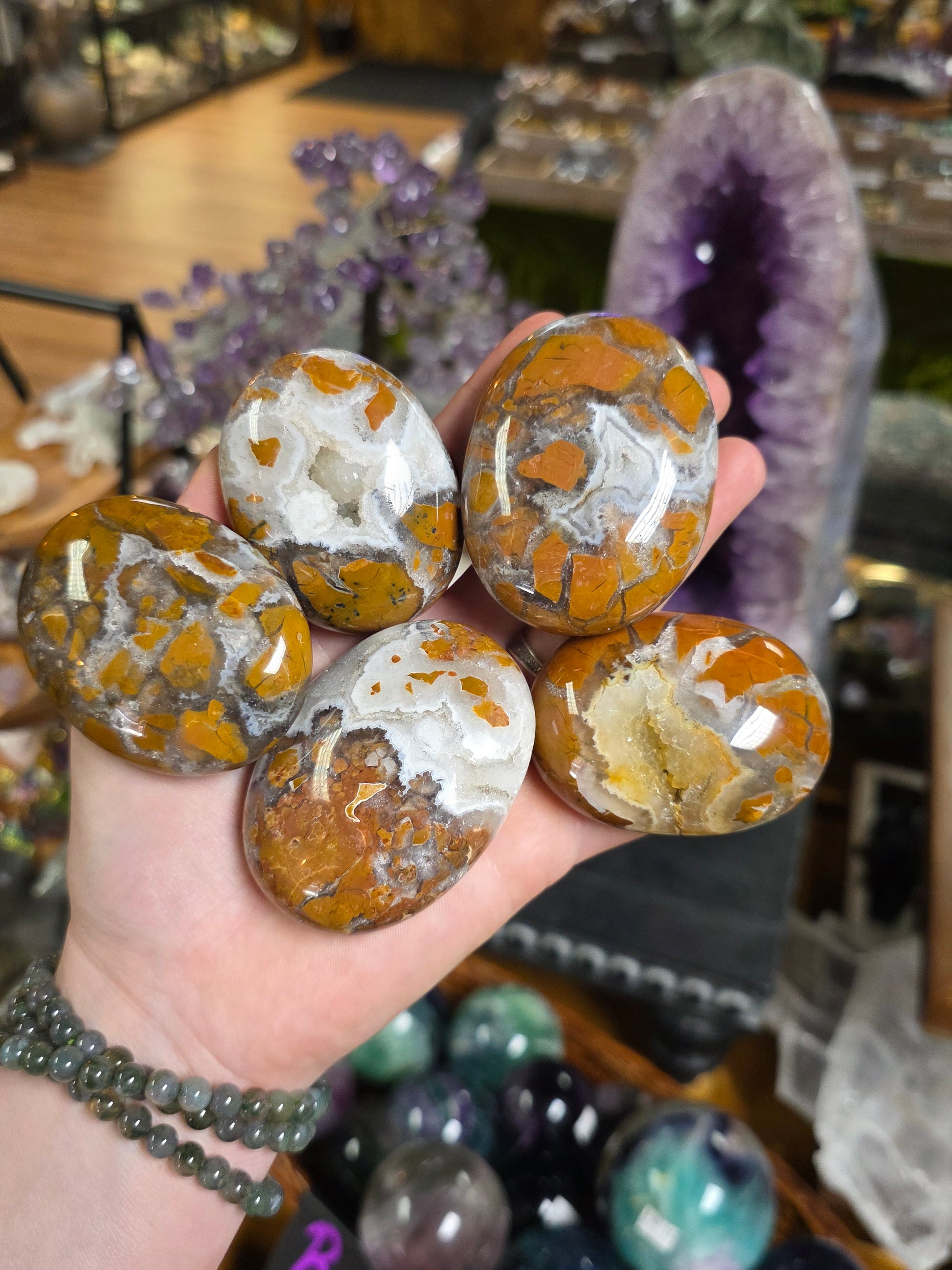 One medium to large randomly selected Indonesian hand polished Jasper palmstone.