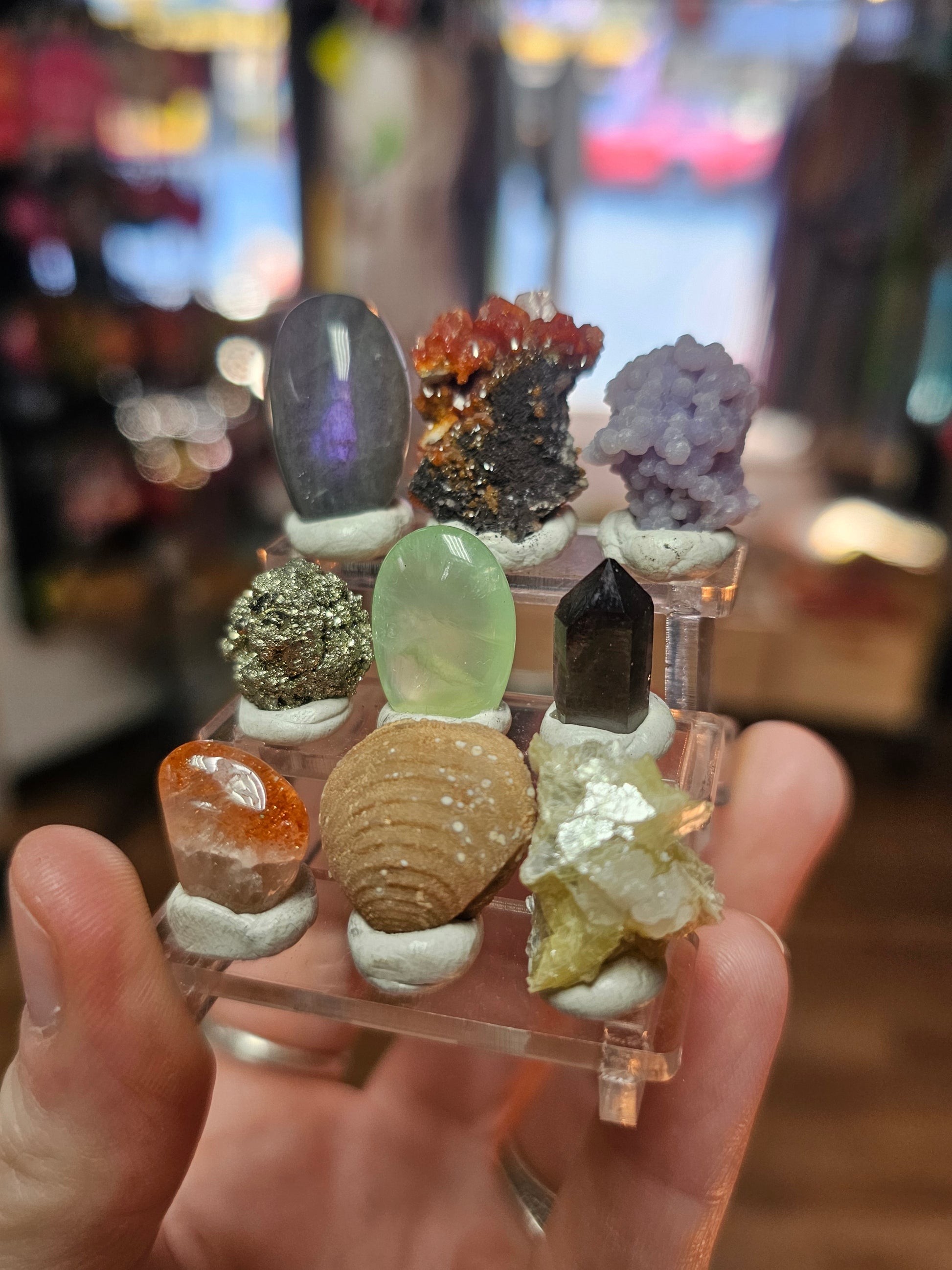 Labradorite, Vanadinite, Grape Agate, Pyrite, Smoky Quartz, Arusha Sunstone, Bivalve Mollusk Fossil, Golden Mica.