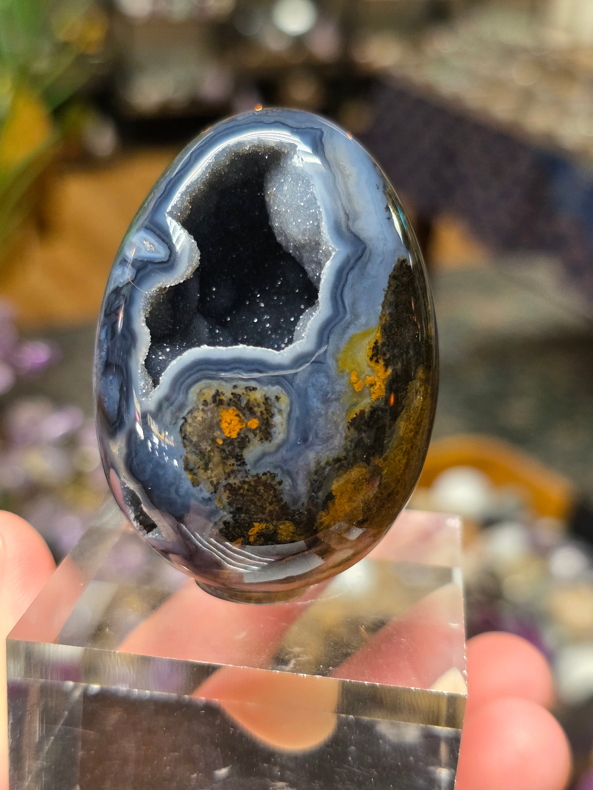 Glued on a clear acrylic stand.